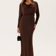 Brun sateng er så elegant. Elsker draperingene på skjørtet og at den er oneshoulder.