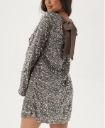 Elsker fargen på denne paljettkjolen, spesielt i kombinasjon med sløyfa på ryggen i en nydelig bruntone.